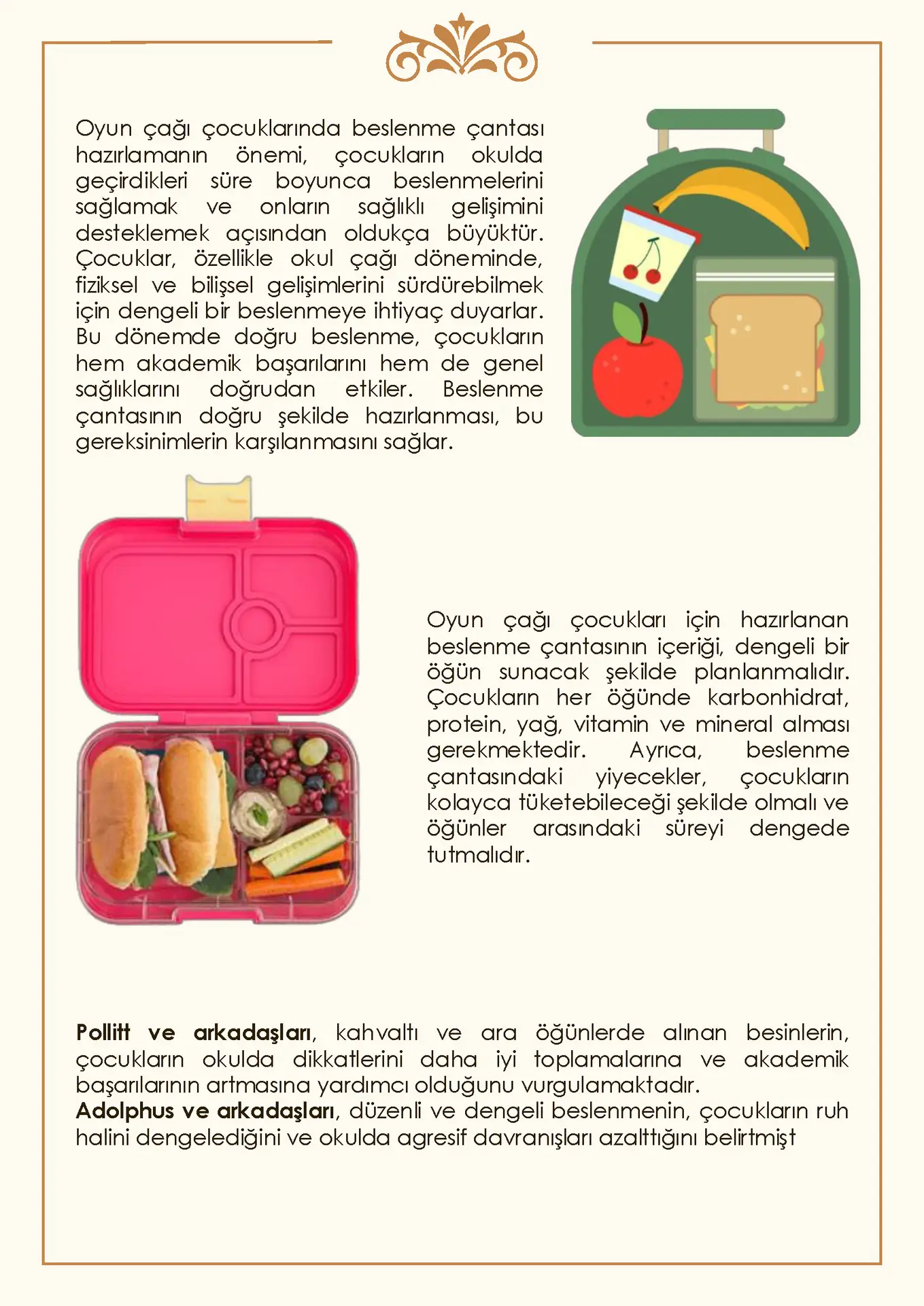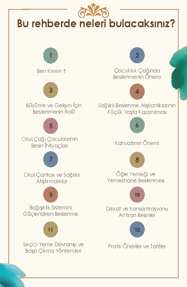 Bu kitapçıkta; sağlıklı beslenme alışkanlıklarının küçük yaşta kazandırılmasından bağışıklık sistemini güçlendiren besinlere, dikkat ve konsantrasyonu destekleyen önerilerden seçici yeme davranışıyla başa çıkma yollarına kadar geniş bir yelpazede bilgi bulabilirsiniz. Ayrıca, pratik tarifler ve okul çantası için sağlıklı atıştırmalık önerileriyle ailelerin hayatını kolaylaştırmayı hedefliyoruz. Çocuklarınızın sağlıklı bir geleceğe adım atmasına destek olmak için bu rehberden faydalanabilirsiniz!
